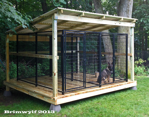 Kennel construction varies depending on location. For places with snow, a roof is essential. Some people like to build a half inside, half outside run. Having half grass is good for teaching puppies to discriminate, but adult dogs often destroy the grass and try to dig under and it just becomes a mud hole. Concrete is easy to clean but expensive and may be a bit hard on joints. Crushed stone looks attractive but is hard to disinfect and keep clean. The best flooring is probably decking, it allows good ventilation and is not too hard. Kennels should be as big as you can afford.